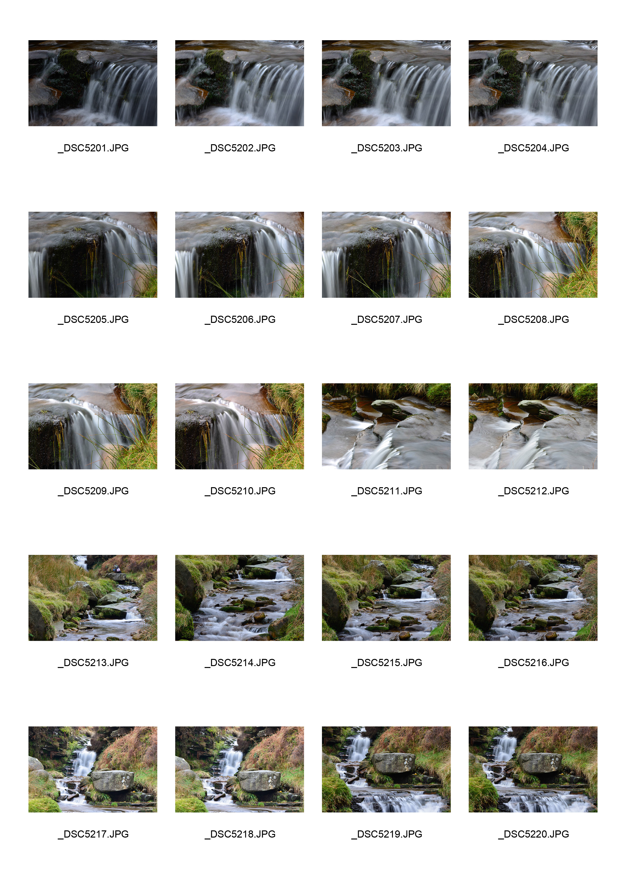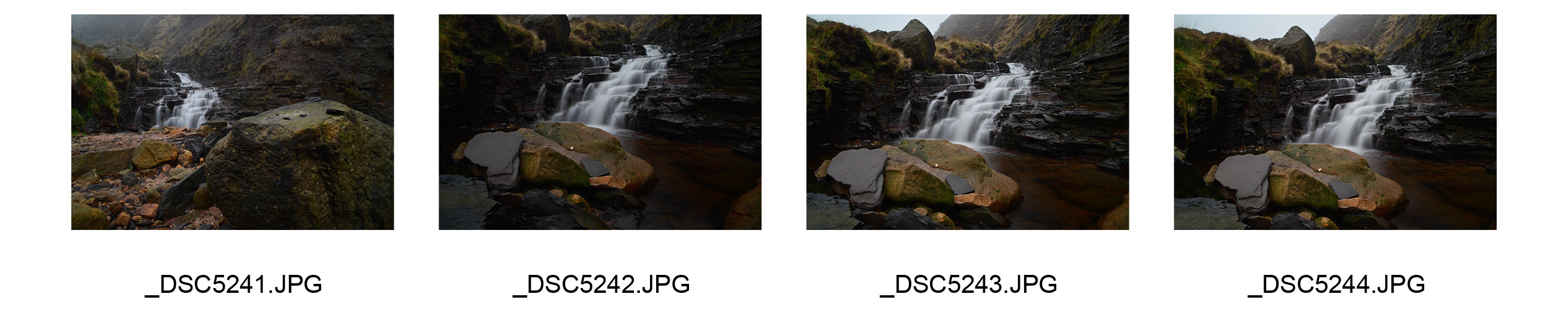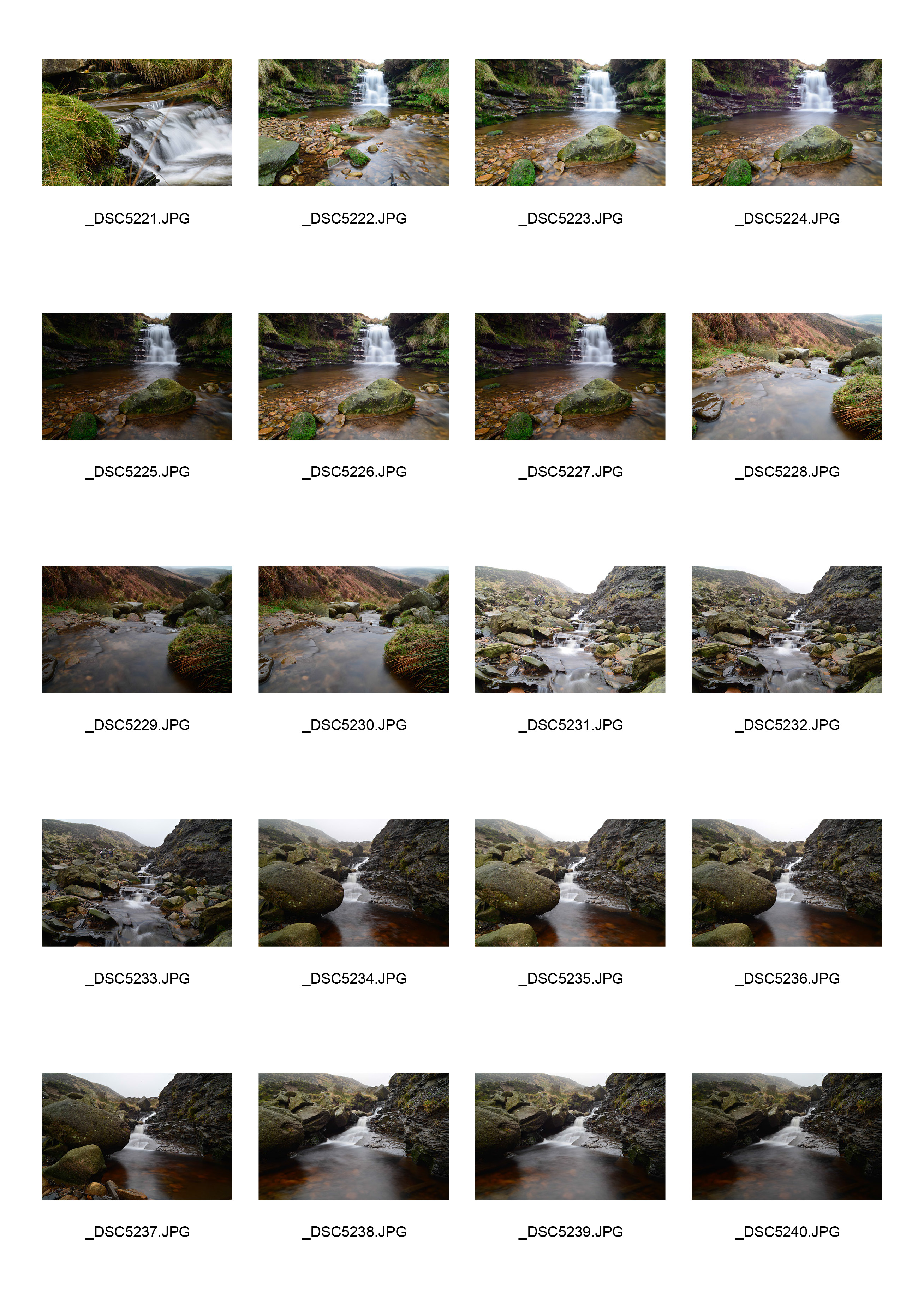 The images show the landscape as static – as we would expect to see it, while the water is fogged and blurred from its movement. What is interesting here is that there is no definitive way of recording the water, here the shutter speeds are all around 1-4seconds, but what is the correct objective way to photograph water? Is 1/250 correct which would capture the scene still, or would 1/15 create something more akin to what the eye sees?