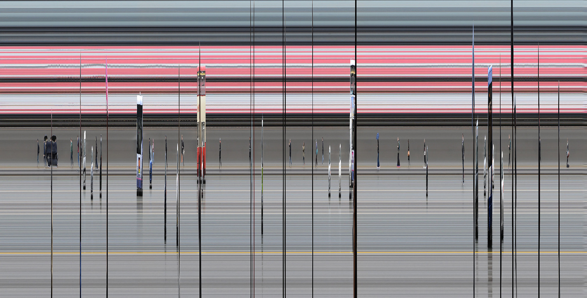 This piece documents a train journey, each veritcle line is from a different photograph, which is compressed horizontally to allow us to view all the images in a smaller, panoramic space. The image becomes a trace of the journey, an image of space and time, and how the artist travelled through it.