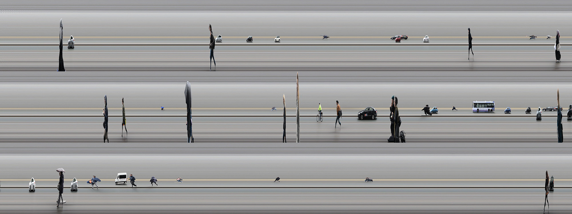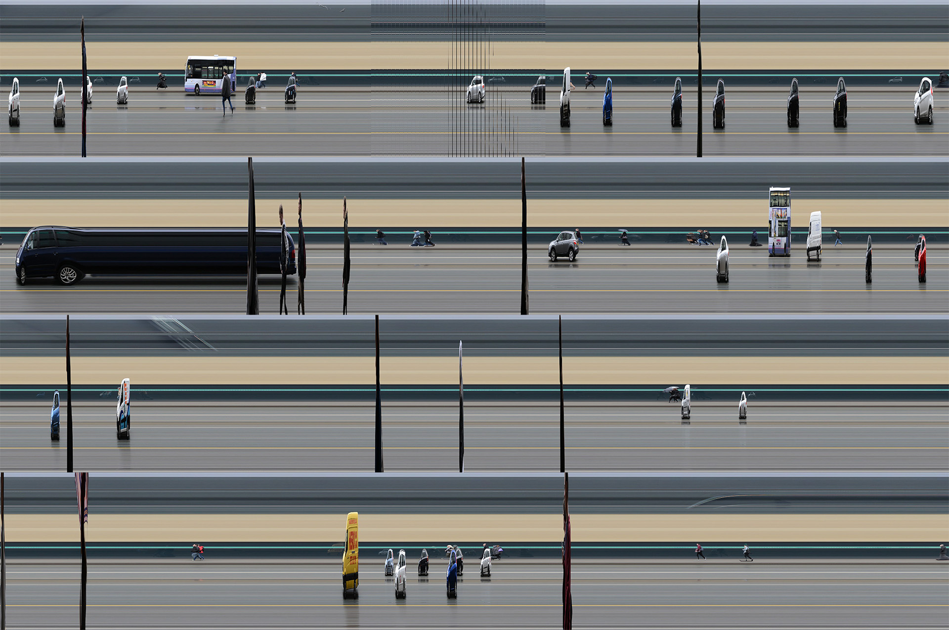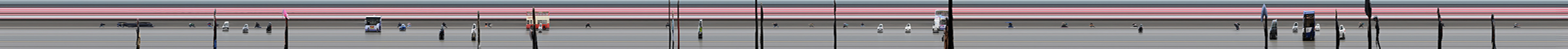 The first image – straight from the process. It is very “squashed” because the speed of the traffic is faster than the camera. To make sense of it I need to stretch the information across the screen, into a large, long, panorama.